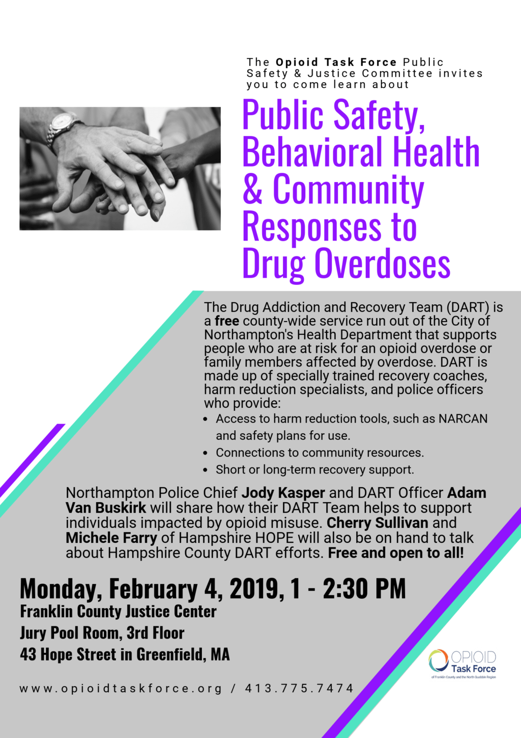 Northampton Police Chief Jody Kasper and DART Officer Adam Van Buskirk will share how their DART Team helps to support individuals impacted by opioid misuse. Cherry Sullivan and Michele Farry of Hampshire HOPE will also be on hand to talk about Hampshire County DART efforts. This event is free and open to everyone. RSVPs not required. For questions or more information, please email info@opioidtaskforce.org or call (413) 775-7474.