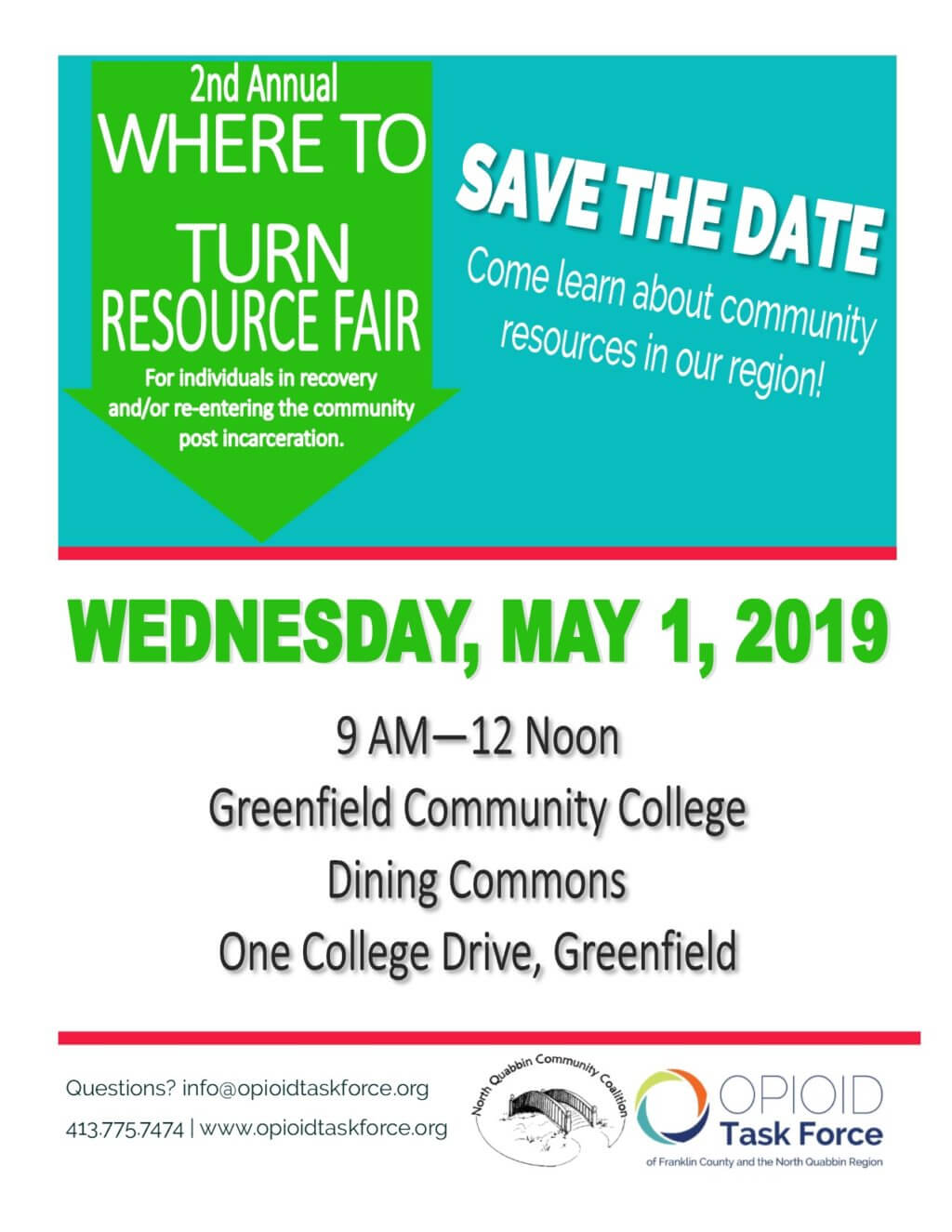 The 2nd Annual “Where To Turn” Resource Fair for Individuals in Recovery and/or Re-Entering the Community Post Incarceration is scheduled for Wednesday, May 1, 9 AM – 12 Noon at Greenfield Community College in the Dining Commons. This event will highlight the many resources available in our rural region for individuals in recovery or those post incarceration including housing, childcare, education and training, jobs, transportation, social services and more!