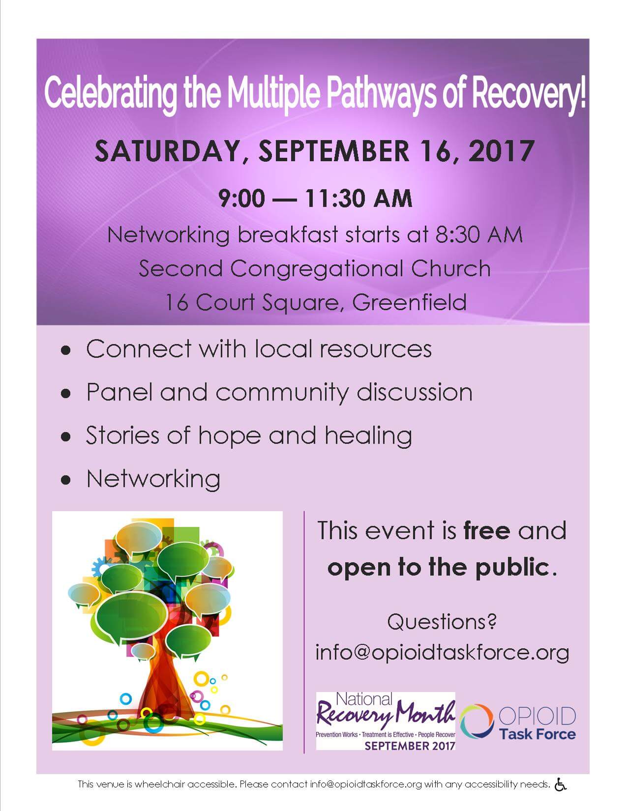 You’re invited! Join us on Saturday, September 16 from 8:30 AM – 11:30 AM at the Second Congregational Church in Greenfield for the Celebrating Multiple Pathways of Recovery event.