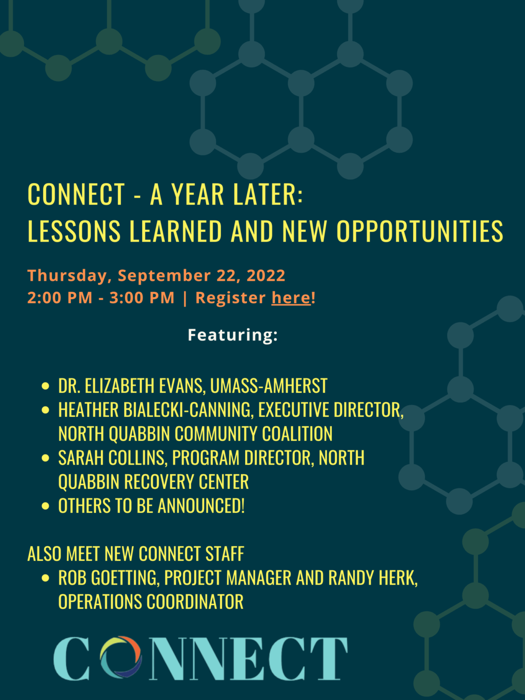 - CONNECT’s Outreach Team: Sarah Collins, Program Director of the North Quabbin Recovery Center, and Heather Bialecki-Canning, Executive Director of the North Quabbin Community Coalition, with more members to be announced; and