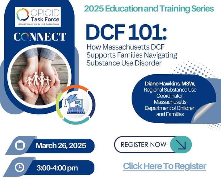 Please join us on Wednesday, March 26, 2025 at 3 PM for DCF 101 with Diane Hawkins, Substance Use Counselor. This session will help explain the array of resources available for parents impacted by substance use disorders. Register here.