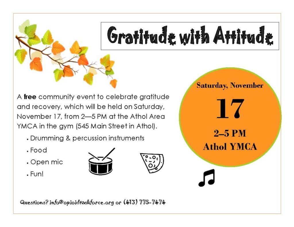 A free community event to celebrate gratitude and recovery, which will be held on Saturday, November 17, from 2 – 5 PM at the Athol Area YMCA in the gym (545 Main Street in Athol). Drumming, percussion, food, open mic and fun! Free and open to the public. All community members are invited and welcome to attend. RSVPs not required. Questions? Please email info@opioidtaskforce.org or call (413) 775-7474.