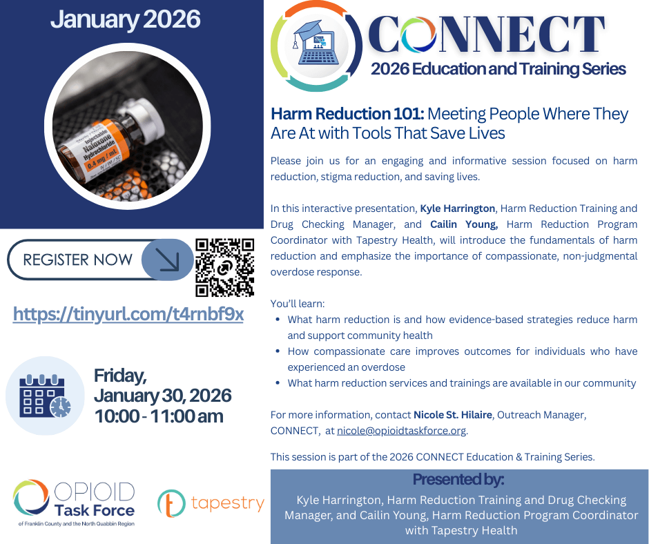 Please join us for an engaging and informative session focused on harm reduction, stigma reduction, and saving lives on Friday, January 30, 2026, from 10 AM to 11 AM. You can register for this free, virtual presentation here.