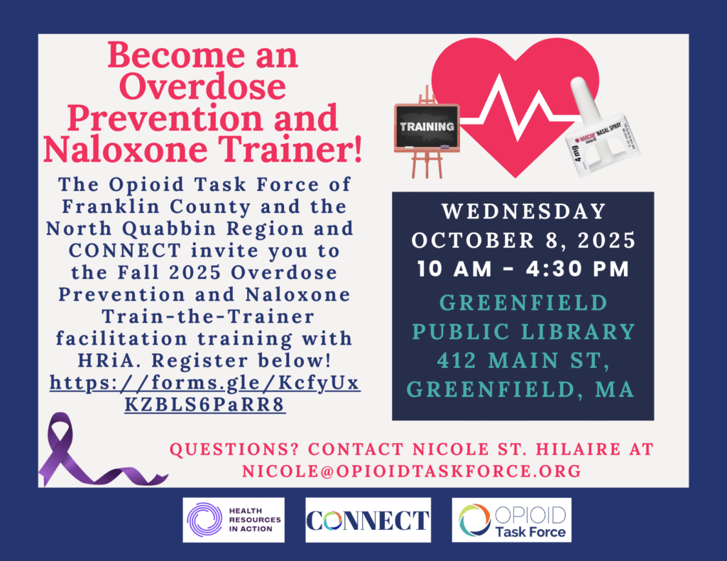 Questions? Don’t hesitate to contact Debra McLaughlin, Coordinator, Opioid Task Force of Franklin County and the North Quabbin Region at debmc@opioidtaskforce.org or Nicole St. Hilaire, Outreach Manager, CONNECT at nicole@opioidtaskforce.org.