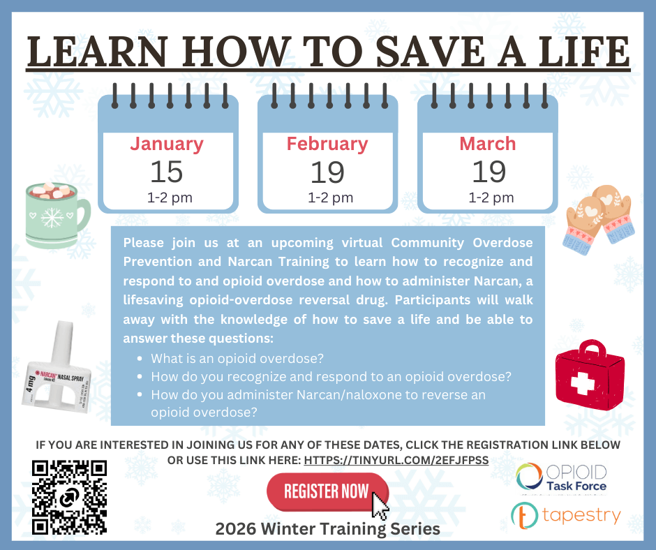This is part of our 2026 virtual Overdose Prevention and Narcan training series, organized by Tapestry and the Opioid Task Force of Franklin County and the North Quabbin Region.