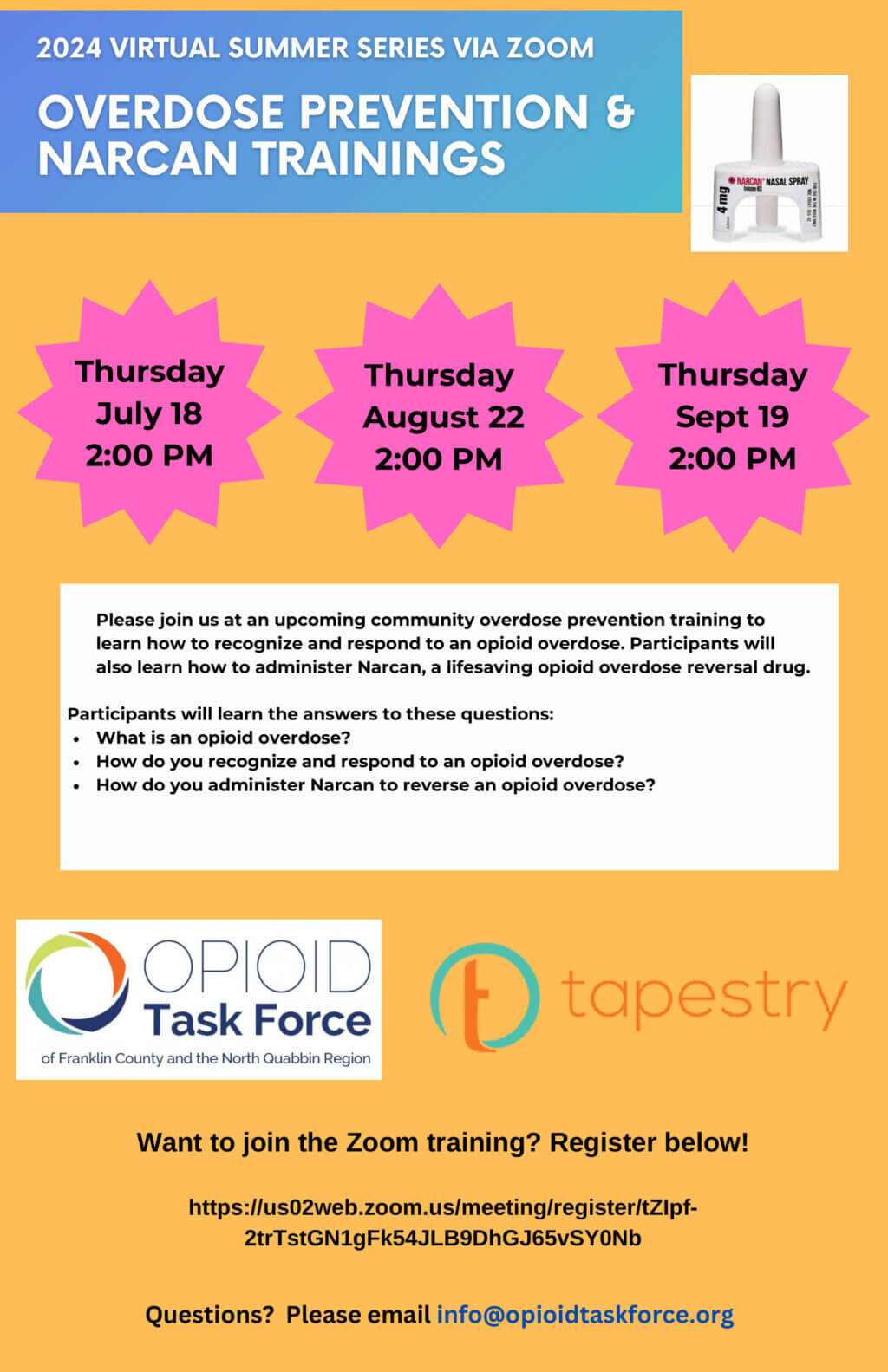 This is part of our 2024 virtual Overdose Prevention and Narcan training series organized by Tapestry and the Opioid Task Force of Franklin County and the North Quabbin Region.