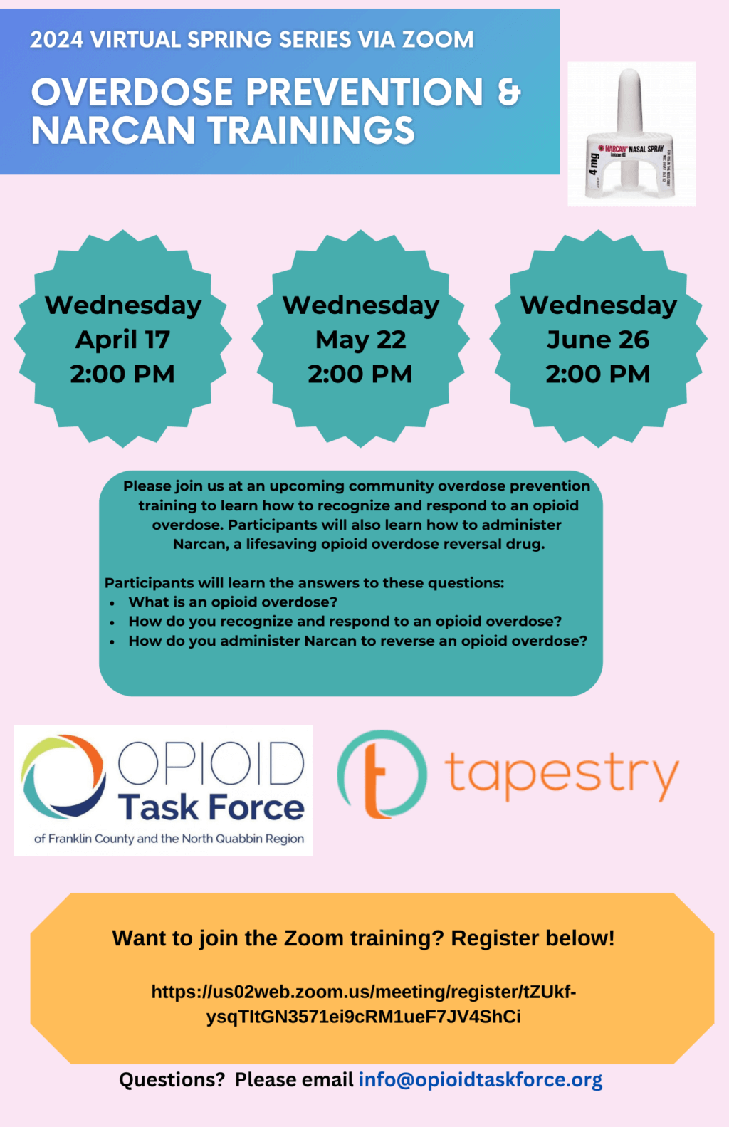 Spring into action and learn how to save a life at an upcoming virtual Overdose Prevention and Narcan training facilitated by Tapestry. It will be held tomorrow, Wednesday, June 26, 2024, from 2 PM to 3 PM. You can register using the following link: https://us02web.zoom.us/ meeting/register/tZUkf- ysqTItGN3571ei9cRM1ueF7JV4ShCi