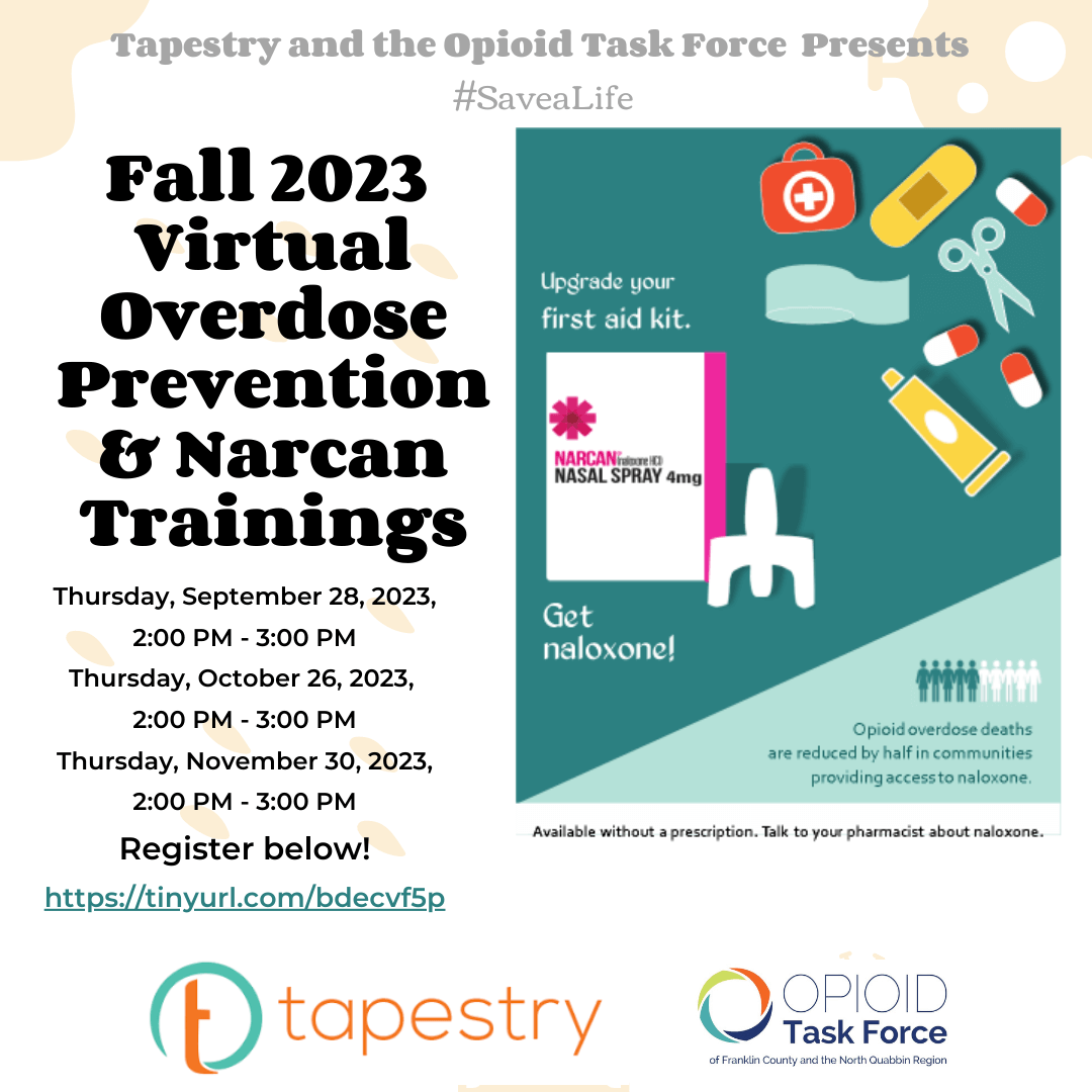 Please join Tapestry and the Opioid Task Force of Franklin County and the North Quabbin Region for this online overdose prevention training.