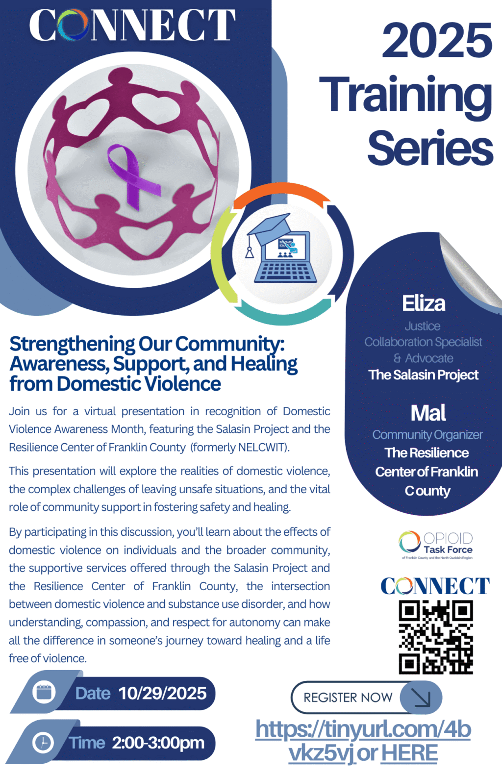 Please join us for a virtual presentation in recognition of Domestic Violence Awareness Month, featuring the Salasin Project and the Resilience Center of Franklin County (formerly NELCWIT) on Wednesday, October 29, 2025, from 2 PM to 3 PM. You can register for this free event here.