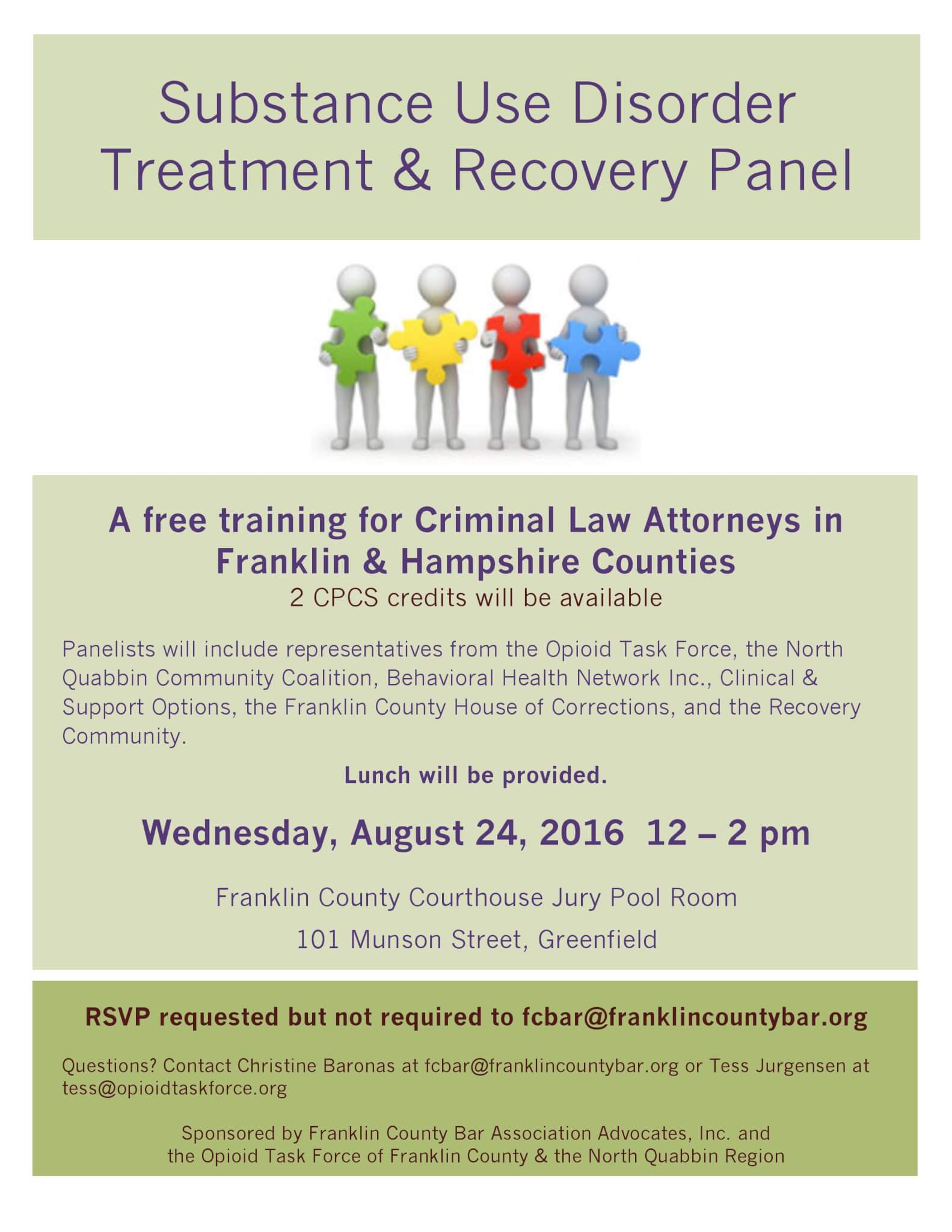 The Opioid Task Force and the Franklin County Bar Association Advocates, Inc. are sponsoring a Substance Use Disorder Treatment & Recovery Panel for Criminal Law Attorneys in Franklin and Hampshire Counties. The panel presentation will take place on Wednesday, August 24th, from 12 – 2 pm at the Franklin County Courthouse. Panelists will include representatives from:Substance Use Disorder T&R Flyer 8.24-page-001