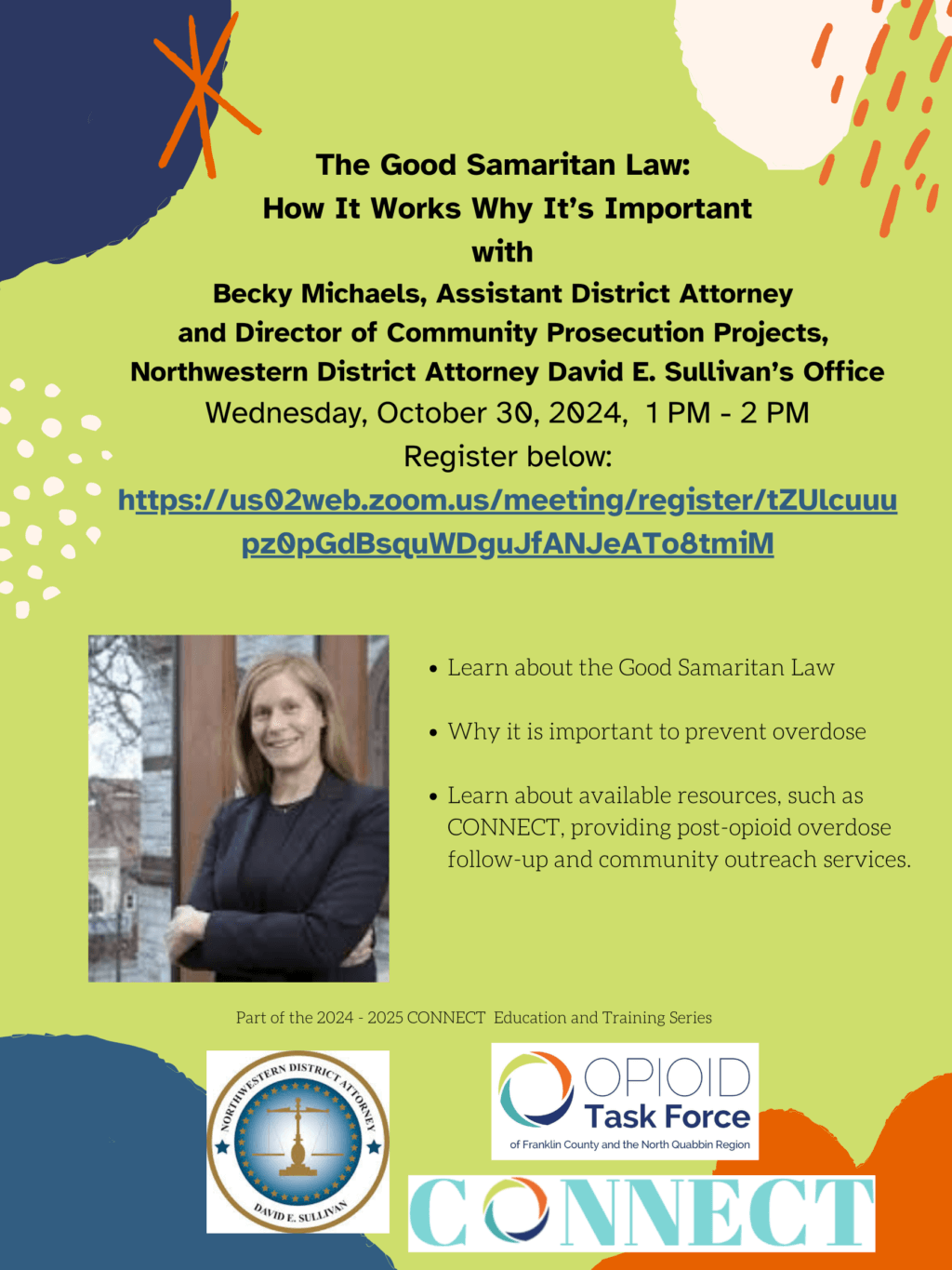 Please join us on Wednesday, October 30, 2024, at 1 PM as we learn more about “The Good Samaritan Law: How It Works and Why It’s Important” with Becky Michaels, Assistant District Attorney and Director of Community Prosecution Projects with the Northwestern District Attorney David E. Sullivan’s Office.