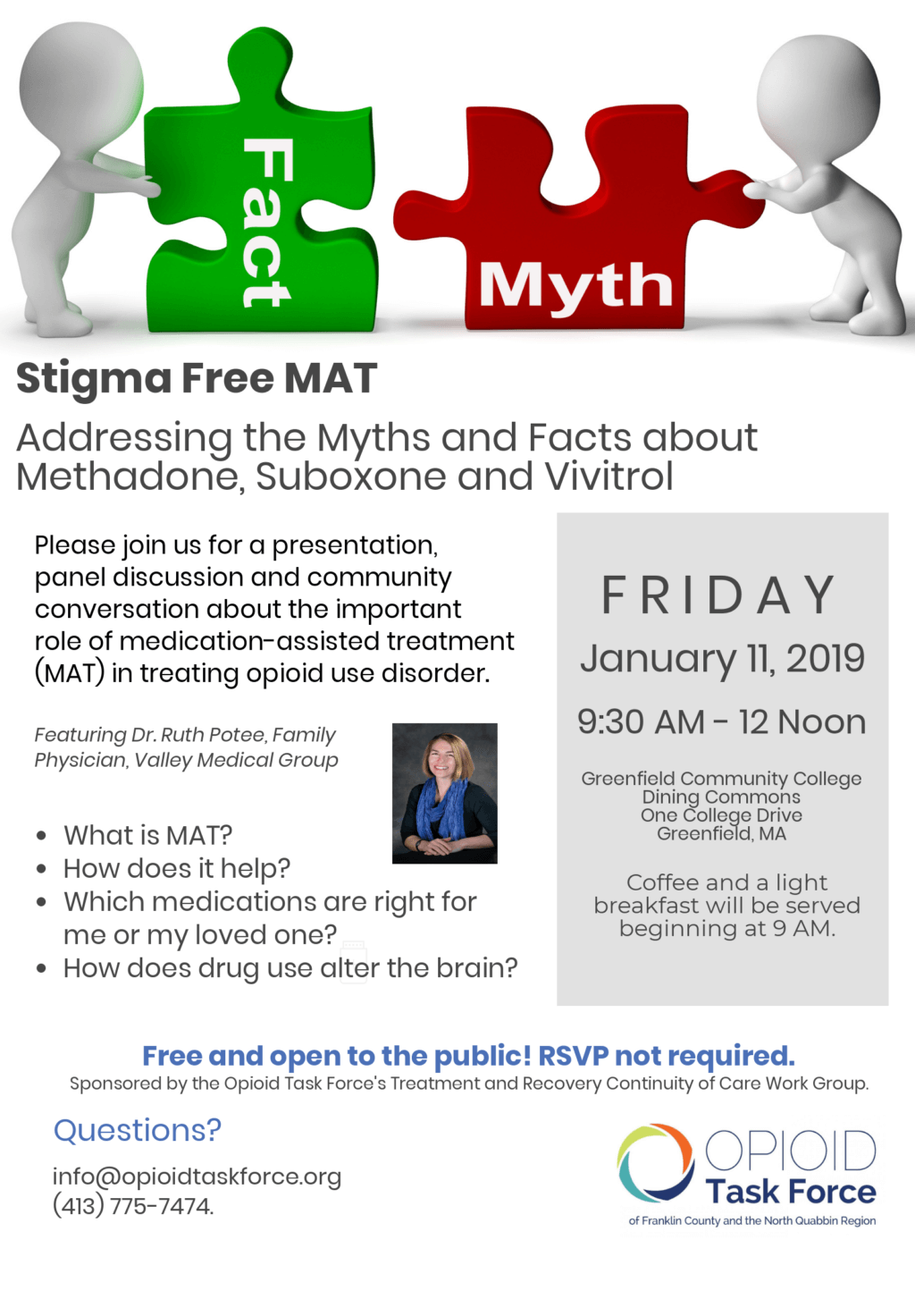 Please join us for a presentation, panel discussion and community conversation about the important role of medication-assisted treatment (MAT) in treating opioid use disorder. This event will feature a presentation by Dr. Ruth Potee, Family Physician at Valley Medical Group and Co-Chair of the Opioid Task Force’s Healthcare Solutions Committee. Free and open to all community members. RSVP not required.