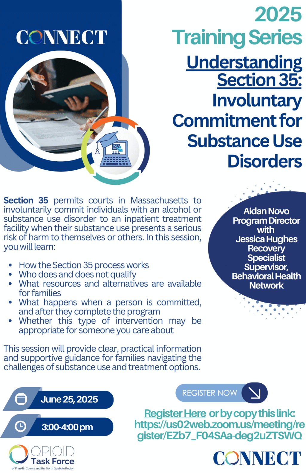 This is part of the CONNECT 2024 – 2025 Education & Training Series. (CONNECT is a post-opioid overdose and community outreach effort sponsored by the Opioid Task Force of Franklin County and the North Quabbin Region in collaboration with its partners.)