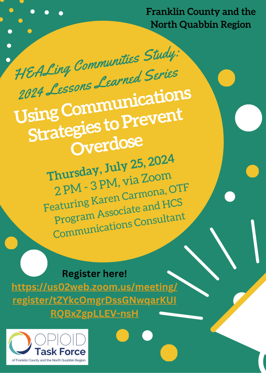 Featuring Karen Carmona, OTF’s Program Associate and HCS Communications Consultant, participants will view the array of communication materials created for the study, learn how they were used, and provide input into what else is needed to provide information about opioid use disorder and available resources in rural Franklin County and the North Quabbin Region.