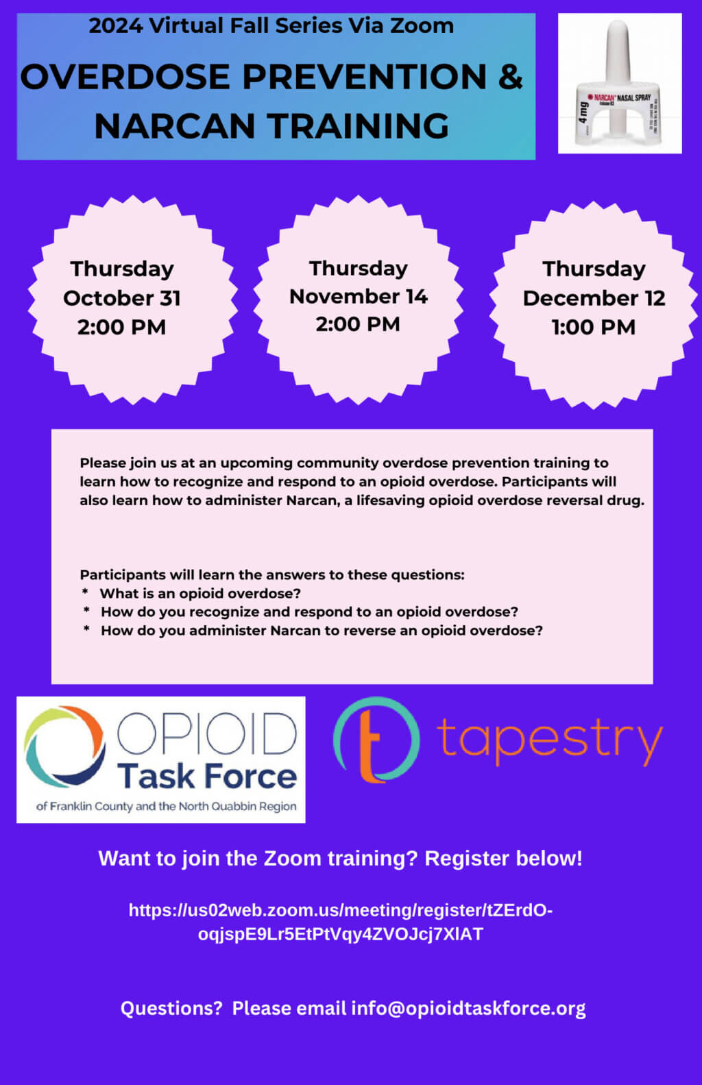 This is part of our 2024 virtual Overdose Prevention and Narcan training series, which is organized by Tapestry and the Opioid Task Force of Franklin County and the North Quabbin Region.
